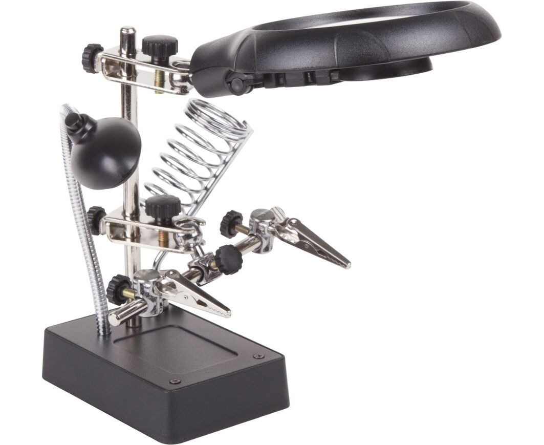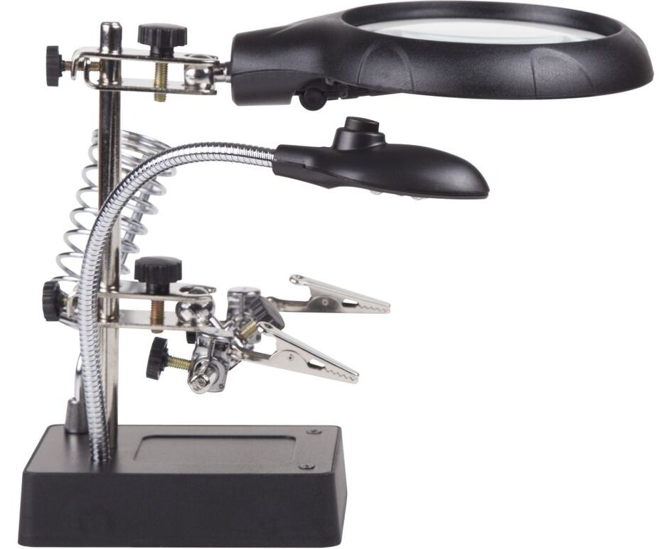 Третья рука идеальный помощник, при работе с мелкими деталями,когда не хватает двух рук. Модель с лупой х2.5 + х7.5, подставка под паяльник и LED подсветкой. С помощью лупы можно будет рассмотреть даже самые мелкие детали.